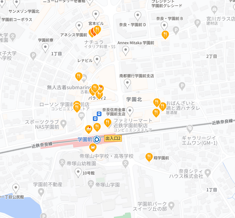 購買部(売店)は休業していますが、近鉄学園前駅周辺の施設に飲食店が複数ございます。