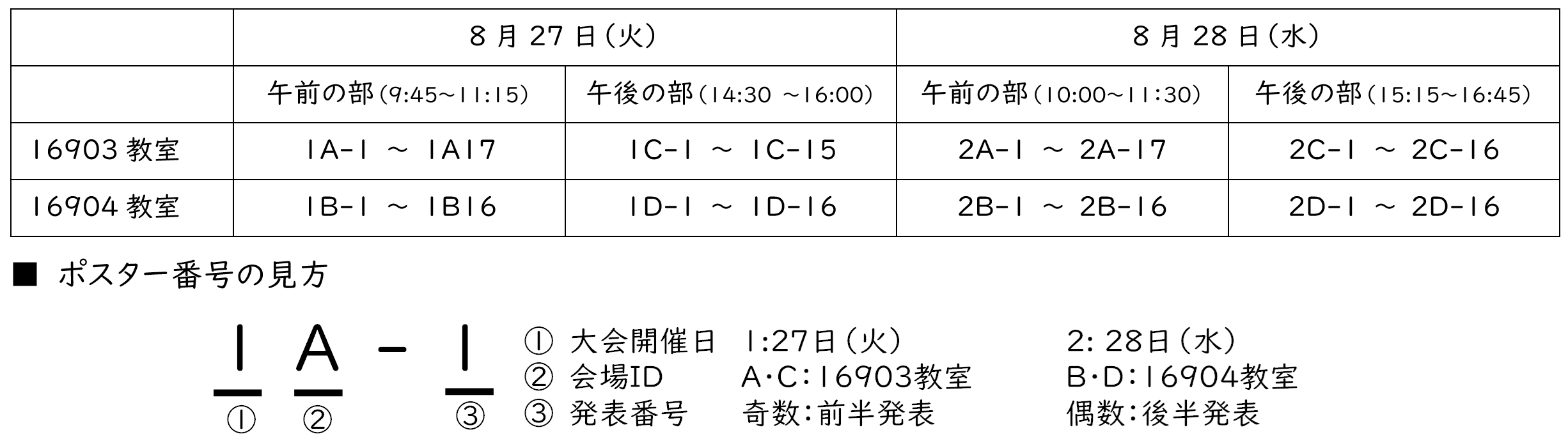 - ポスター発表会場は、16号館9階16903・16904教室にて行います。今回大会では、ポスターセッションを両日ともに午前の部、午後の部に分けております。