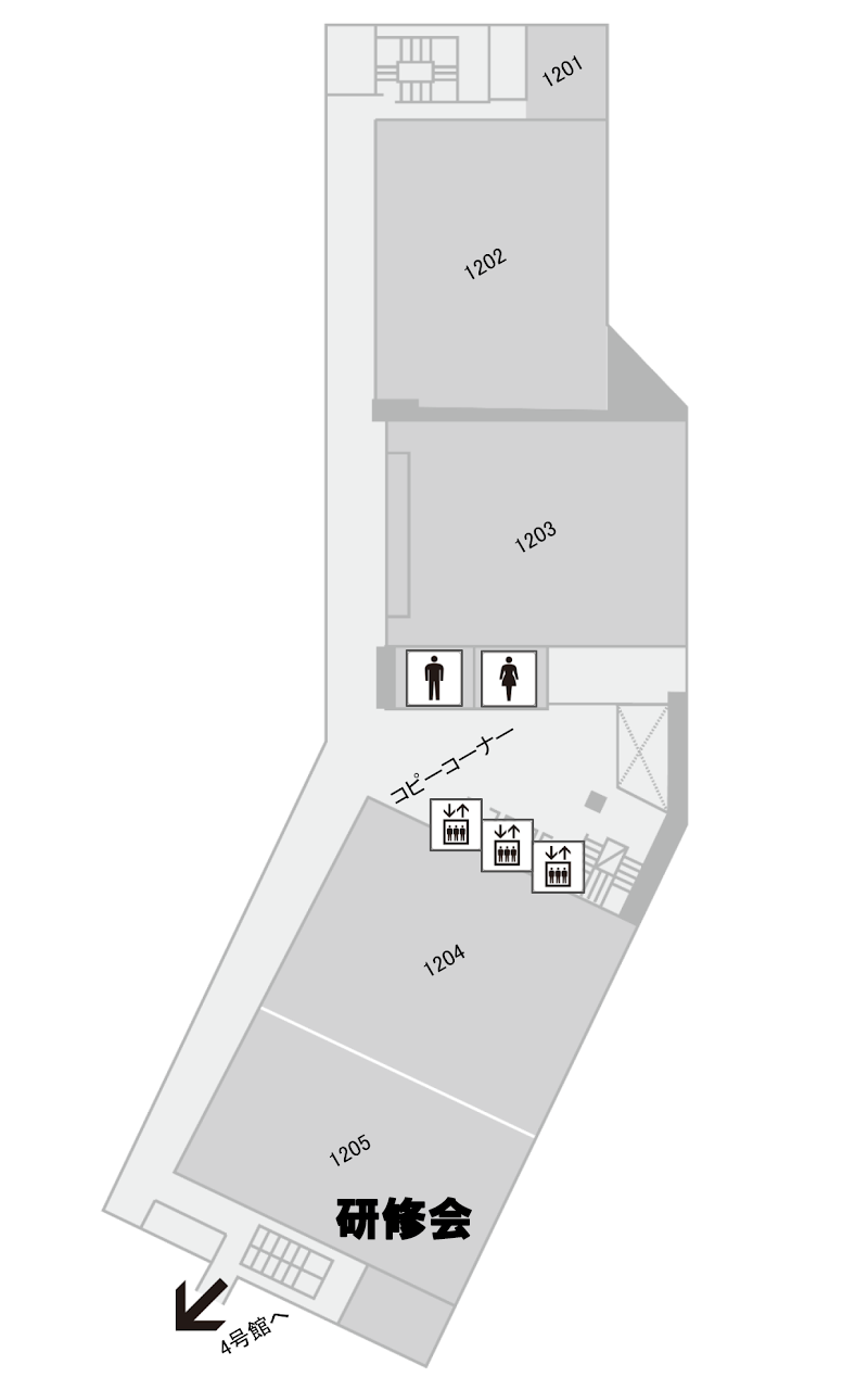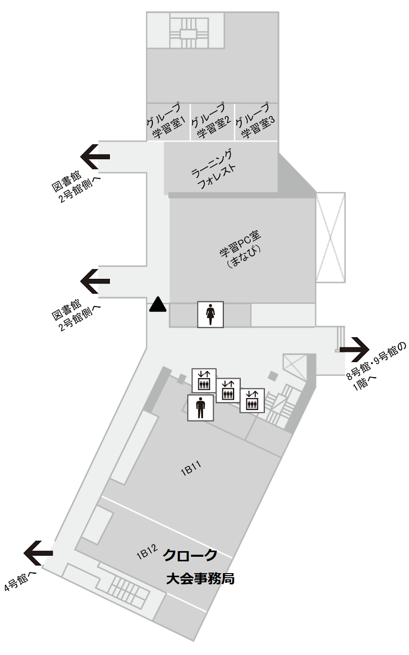 8号館隣の1号館地下1階1B12教室が,クロークとなっています。また,大会事務局も同じ部屋です。