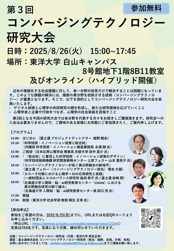 趣旨:近年、AIと心理学を融合したコンバージングテクノロジーが、社会課題解決への新たなアプローチとして注目を集めています。そこで本企画では、コンバージングテクノロジー研究会第3回大会を併催し、AIと心理学の融合による社会実装の最前線を検討してみたいと考えています。過去,コンバージングテクノロジー研究会大会では、産官学の専門家による刺激的な講演を行い,熱い討議を続けてきました。例えば,内閣府からは総合知に関する話題提供や、大学研究者からは組織に着目した病院再編に関する実践報告など、学術的にも実務的にも大変意義深いテーマを取り上げてきたところです。