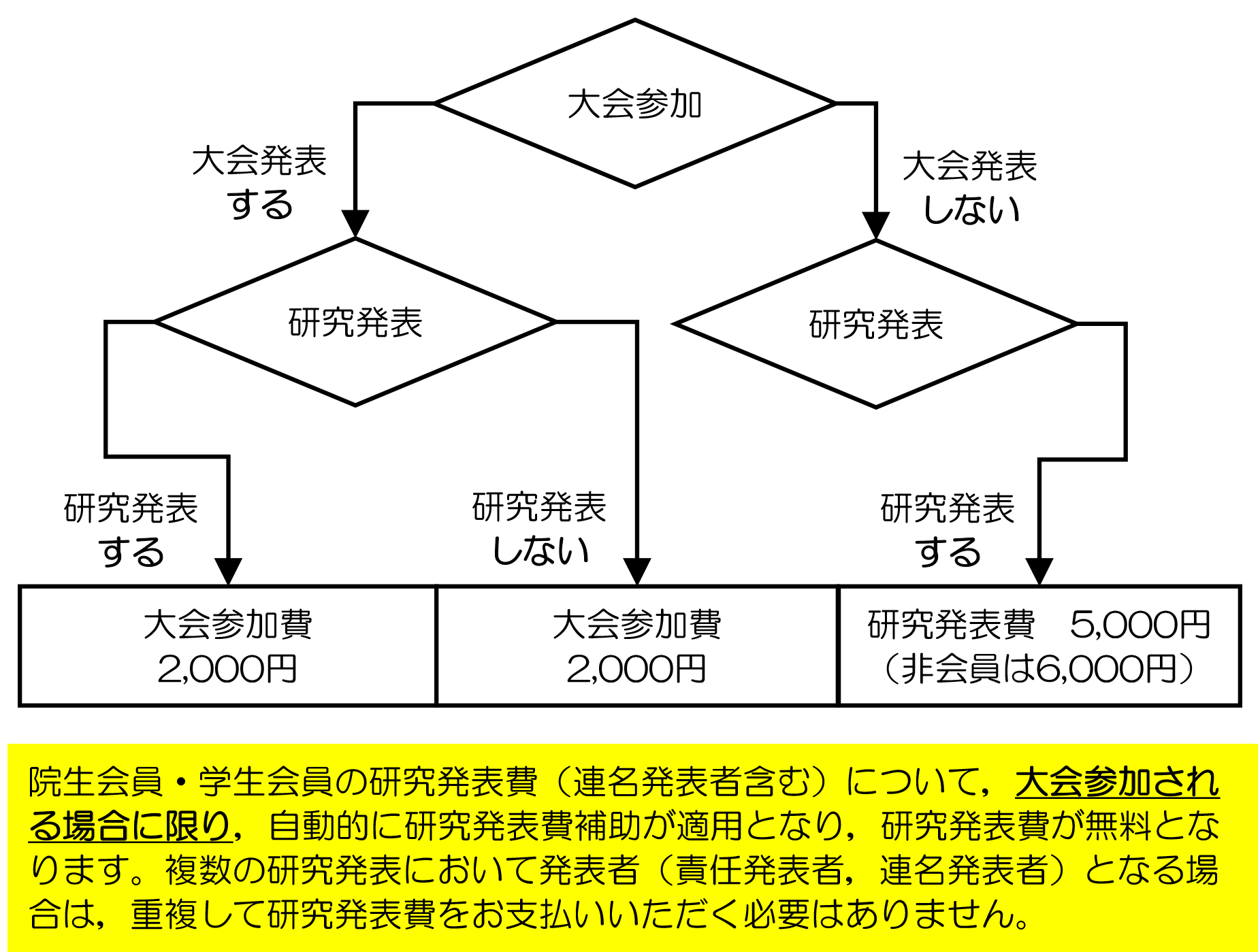 なお,連名発表者で大会に参加されない方は,院生会員・学生会員であっても,研究発表費補助は適用されません(院生会員・学生会員は「5,000円」,非会員は「6,000円」の支払いが必要)。
